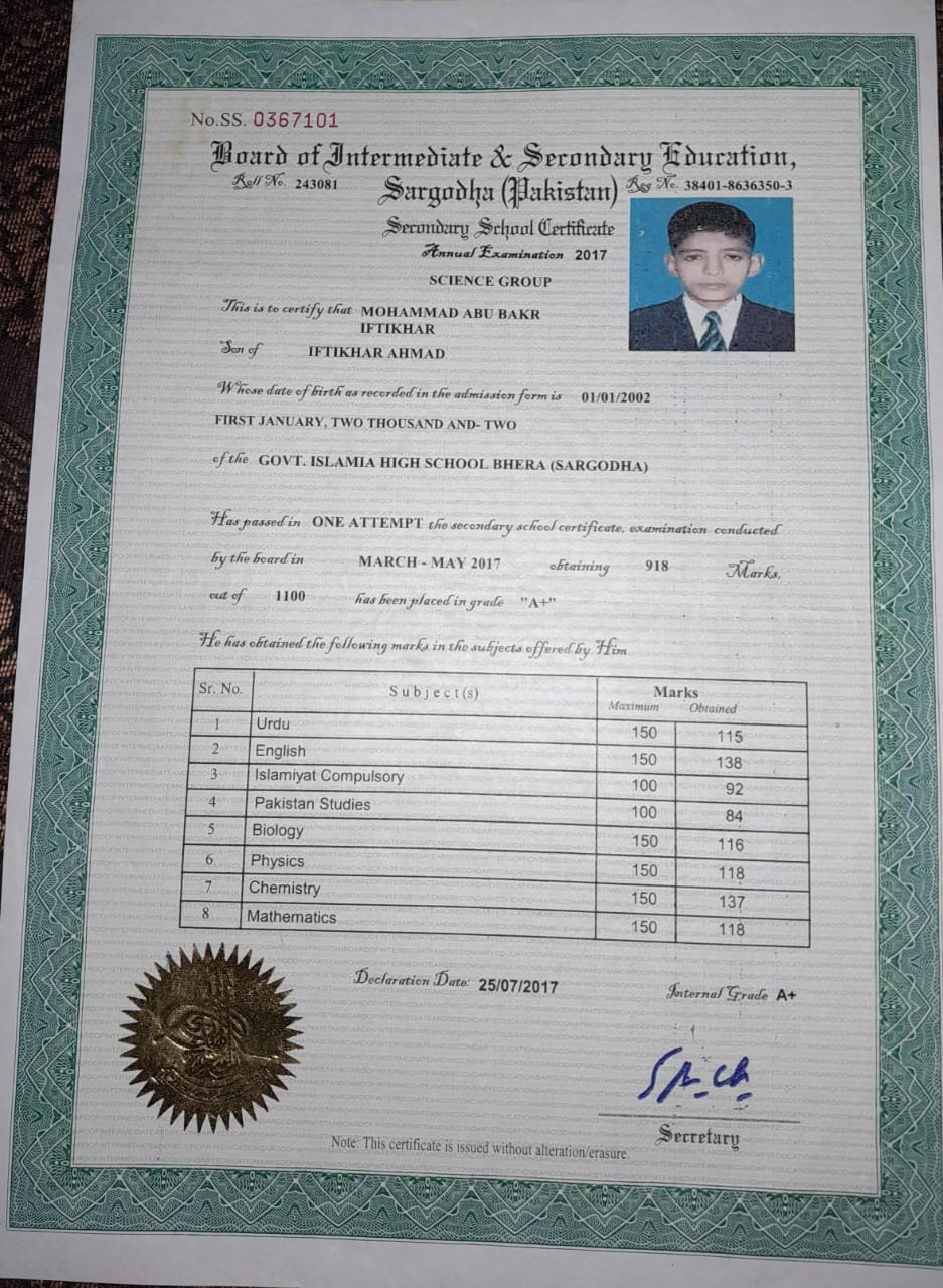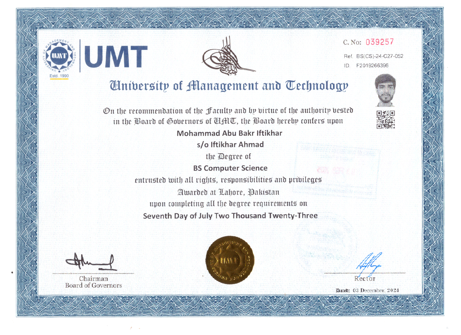 I am pleased to recommend Mr. Mohammad Abu Bakr Iftikhar (Student ID: F2019266396) for your Master’s program. As his professor in the Computer Science program at UMT, I observed his strong analytical skills, deep understanding of data structures and algorithms, and consistent enthusiasm for challenging problems. He excels both independently and in teams, and I am confident he will thrive in an international academic setting. I endorse his application without reservation.